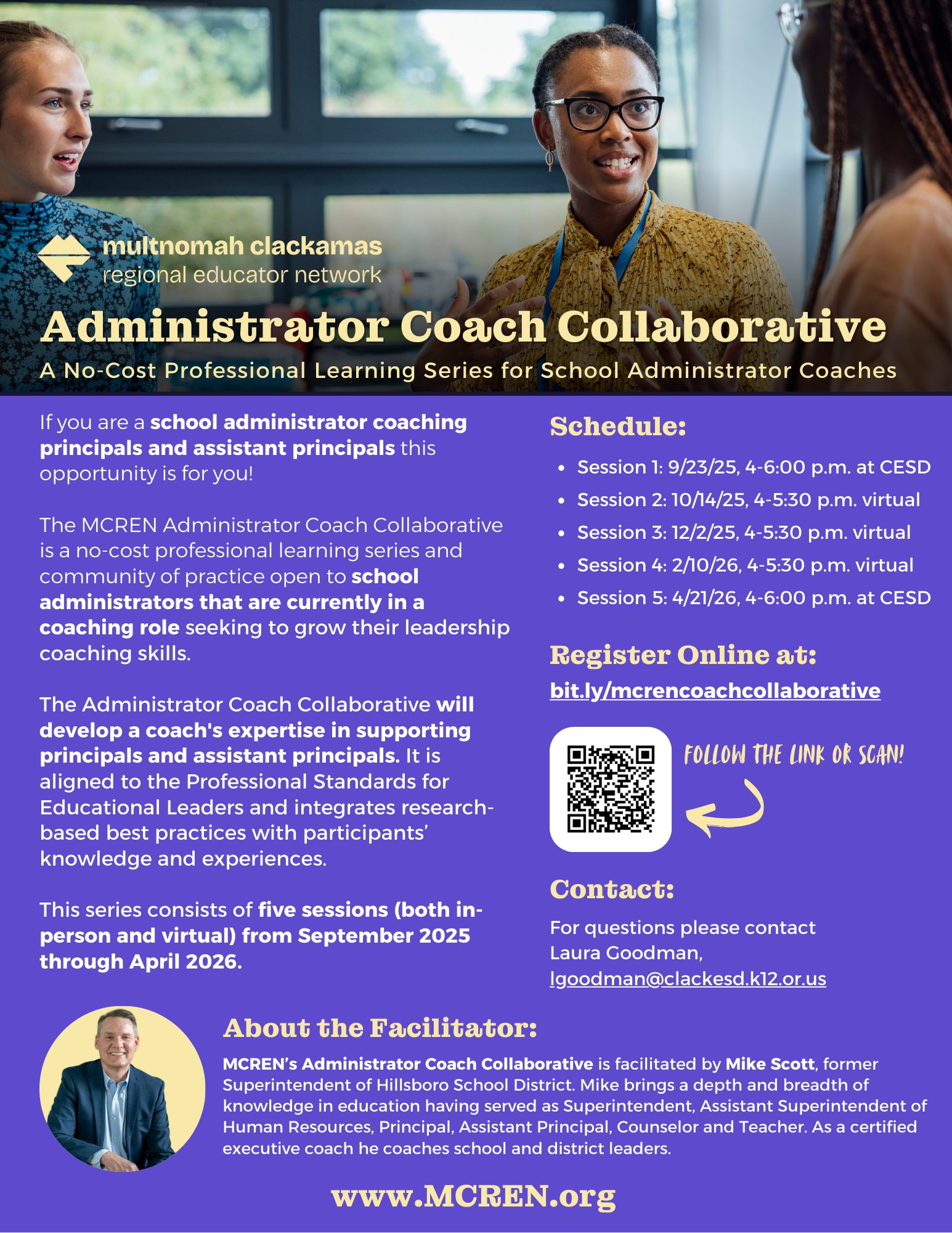 MCREN’s Administrator Coach Collaborative is facilitated by Mike Scott, former Superintendent of Hillsboro School District. Mike brings a depth and breadth of knowledge in education having served as Superintendent, Assistant Superintendent of Human Resources, Principal, Assistant Principal, Counselor and Teacher. As a certified executive coach he coaches school and district leaders.