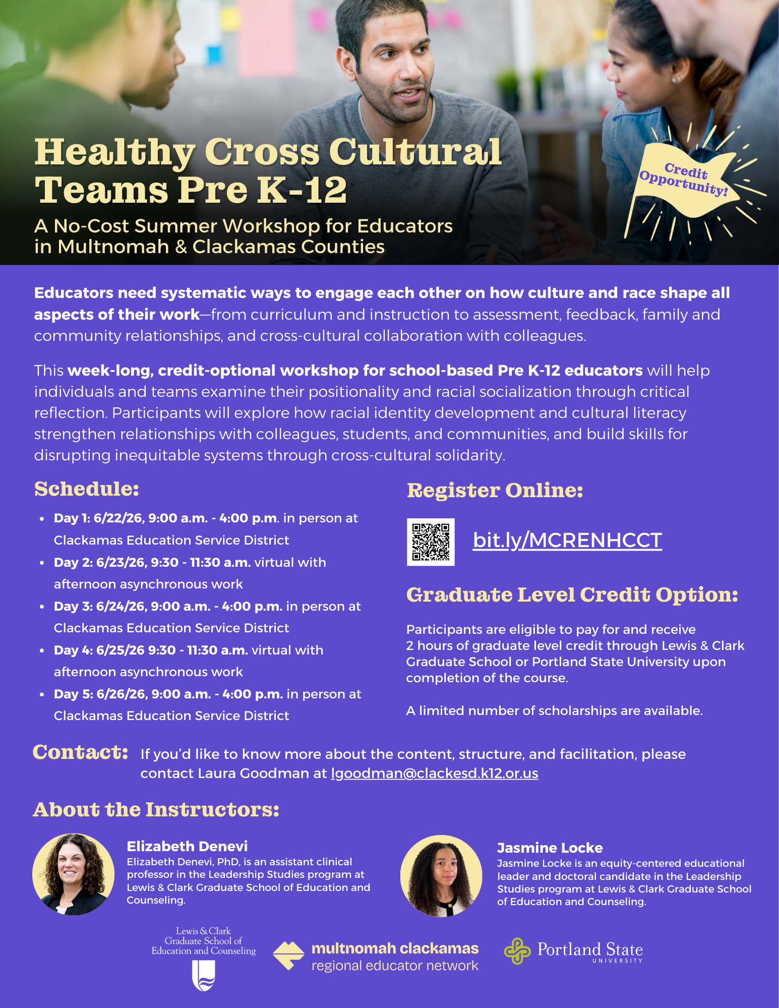 - Day 5: 6/26/26, 9:00 a.m. – 4:00 p.m. in person at Clackamas Education Service District